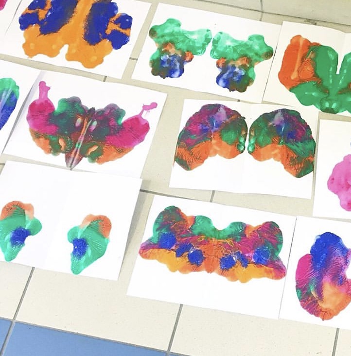 La réalisation à la peinture, pour définir clairement l’axe de symétrie et la manière dont la peinture se superpose en refermant la feuille en deux, à la manière miroir.