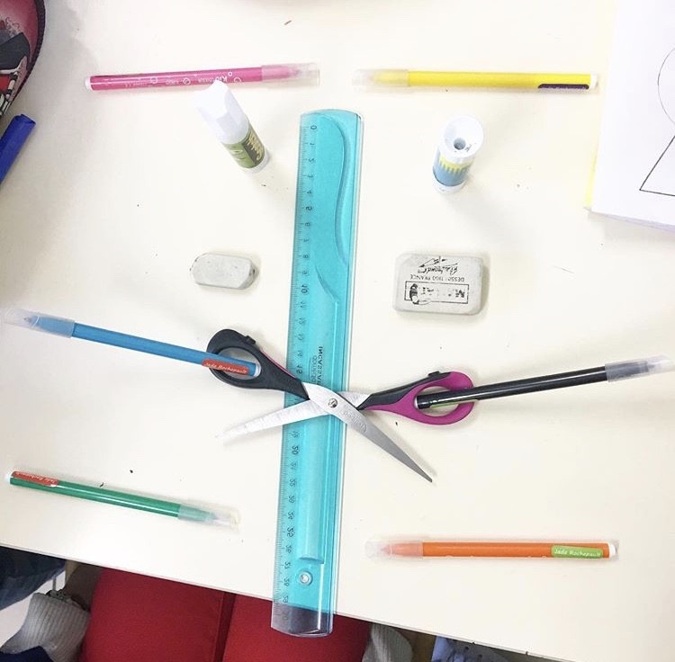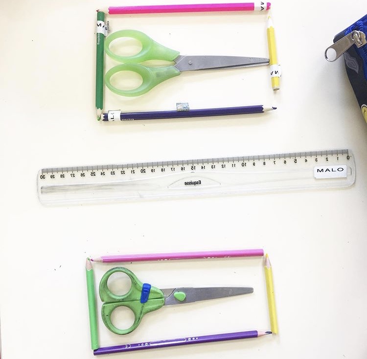 Nous avons commencé par apprivoiser la symétrie avec le corps et la règle en guise d’axe de symétrie. L’idée vient de la copine Nina, des Maitresses en baskets. L’article en question, juste là.